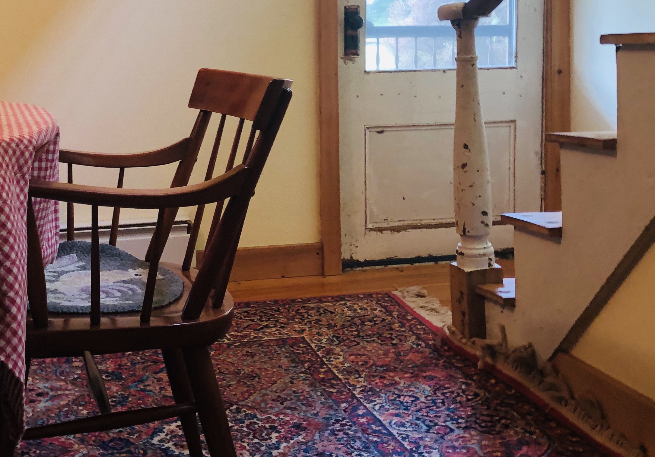 Today, the sun is even brighter and the sky is devoid of clouds. The atmosphere is indifferent to the human pain below it, in it. (After all, the sunlit sky is what we inhale). Such atmospheric imperviousness makes it possible, even easy, for me to drop the thin veil of mourning that conscience wears. (Were it cloudy, could I write this? Unlikely.) The insistence of the morning light forces my attention away from the flat screen of the weekend’s shootings. Instead, in a fit of domestic voyeurism, I’m watching the one of the spaces in our house, a space whose air is undisrupted except by the passage of light within it. I’m staring at the front room – part dining room, part way-station for things in transit –intruding on a barely-stilled tableau that hovers between two and three-dimensions. The players include my parents’ 1960’s Shaker-style cherry chairs and table, a copper chafing dish, two distinctly Western landscape paintings from my husband’s family, and under it all, my mother’s Karastan rug from Macy’s in New Jersey. Despite the fact that we’re family, the denizens of the dining room are as indifferent to me as death. (Just as the the sky is to the grief in Texas and Ohio.) But this isn’t a matter of unrequited love. I already have the love gifted to me through them. And as for the objects themselves, they may be technically mute but their forms have dialects all their own: overlapping silhouettes, patterns peeking through the chair legs, pictures adding dimensions to the flatness of the walls. Moreover, I have no doubt that something ‘real’ emanates from their molecules and the particles of light that animate them. The oil of fingerprints polished away by Old English, the oil-based colors of painted sky and rocks, the industrial dyes of the rug: they take longer to die.