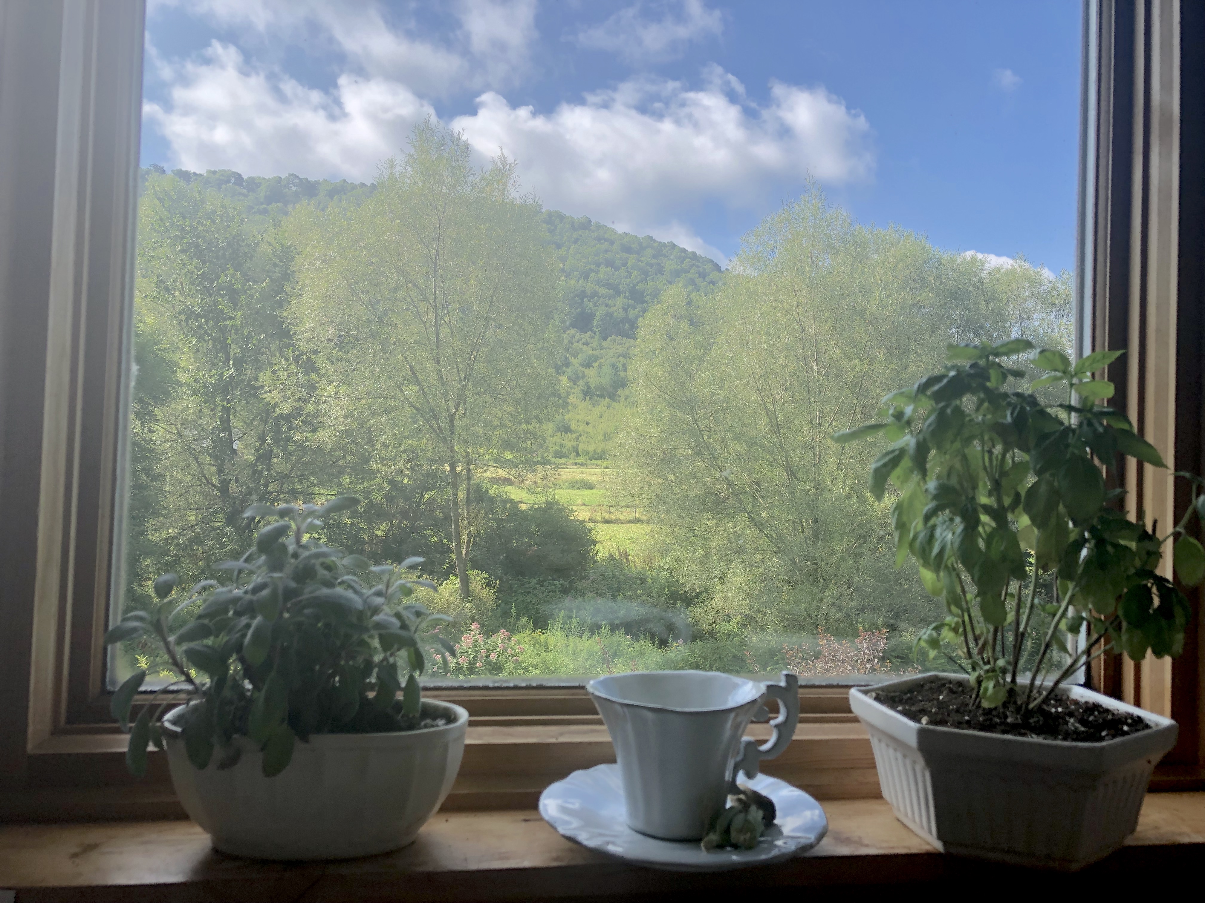 If I were writing a novel about a woman at home in the morning in the country, I’d begin by describing the stillness. The woman would just have to open a door to change that, but she doesn’t because she feels cocooned by the quiet. She’s reluctant to break the narrow space that is taken up by her plants on the windowsill and the long kitchen table, where her laptop sits on top of a pile of books so she won’t strain her neck. The laptop is this laptop, above it and outside the window is another tight view—this one of the hill that arcs across her field of vision. Not quite flattened, the scene that fills her kitchen windows has a limited depth by virtue of being framed by the window mullions. Sitting in the front row of this green theater are herbs in white pots: one with classical fluting like a pilaster stretched at six points, another molded like brick work, and another with widely spaced lines curving up to the rim and circles around its base. They too are satisfying in their apparent completeness. These ordinary oddities, coiffed with basil, sage, and thyme, are exercises in control, defeated by the plants themselves as they persist on leaning toward the sun.