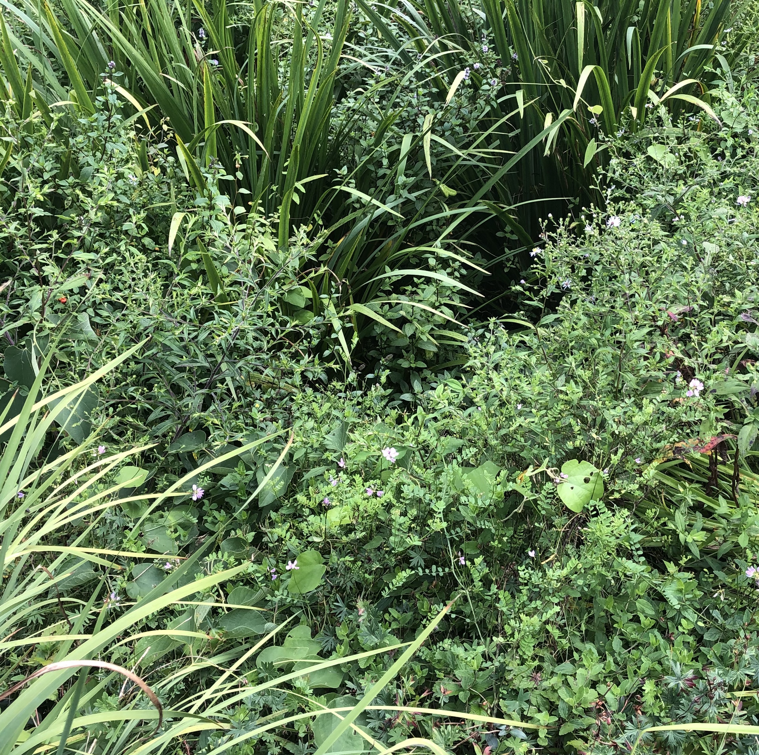 Weeding. I’m ignoring the crown vetch, the wayward Dutchman’s Pipe, the horse mint, the ubiquitous Michaelmas daisies, and invasive black willow shoots that will be trees by next year. (Forget the Japanese knotweed.) They taunt me when the soil is moist like it is today; they’d be so easy to pull. But the closest I’ve come to doing yard work is tying strands of day-glow orange yarn around some transplanted saplings. The hope is that the weed-whacker will skirt them. If they do survive the winter, I’ll have a bank of white iris along the stream. This will be my defensive wall against the onslaught of weeds that love the watery edge of the lawn. Much easier than pulling them out.