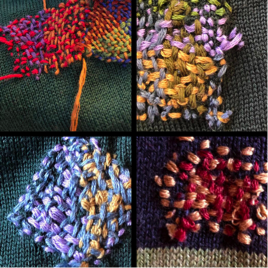 I have always knit, but have recently taken up darning using vivid embroidery floss to transform practical mends into (almost) randomly patterned repairs. I also study the pervasive nature of textiles in the built environment. There is something about the co-dependency of slender threads in forming structures from garments to rugs to architecture that I find compelling. I find it especially absorbing to watch how the movements of fibers (via the techniques of making) gradually bring those structures into appearance and into other dimensions.