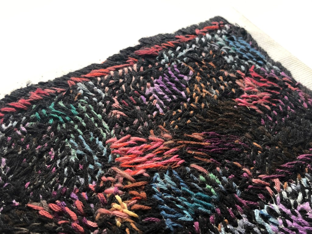 When I was done stitching, David pointed out that I was not only creating an echo chamber among the various iterations of the darn, I was also using a process that paralleled the AI’s learning curve by negotiating between two images to produce one. And then there was the factor of light: color choices made working in the evening varied from those made in sunlight during the day. Neither choice was ‘correct,’ each was an option. I realized that there was also another correspondence between the virtual and the analog in that, like the machine, which could have kept going and produced other variations on the ‘darn,’ I also could have kept stitching and refining the sewn surface. The entire notion of “finished” is incorrect in both cases—something I think is quite important because it leaves the process open and recognizes the larger point that things are never finished because of the infinite possibilities for their perception.