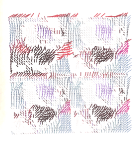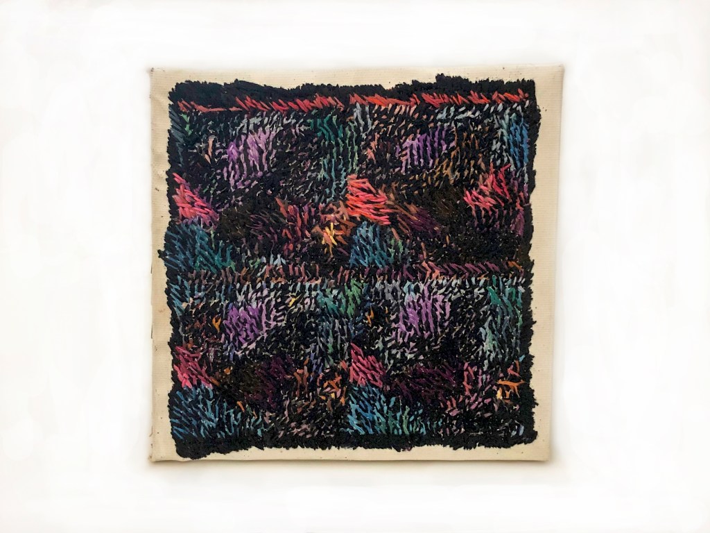 Given these preoccupations, I asked David whether he also saw some resemblance or relationship to textiles in his work. He had and he proposed that we collaborate. He would feed digital images of my embroidered darns into an AI program that trained itself to produce an image of a darn, not unlike the way images of faces are fed into AI/machine learning programs to create facial recognition software. In our case, David had the machine generate new images from the training data (the digital photos of my darns). He then he took the machine generated images, manipulated them with his own custom code, and printed one that we selected together for me to stitch back into an analog state.The image we chose was printed on paper with a black ground but since paper would be impossible to embroider, David also printed it on a square of sturdy, white canvas.
