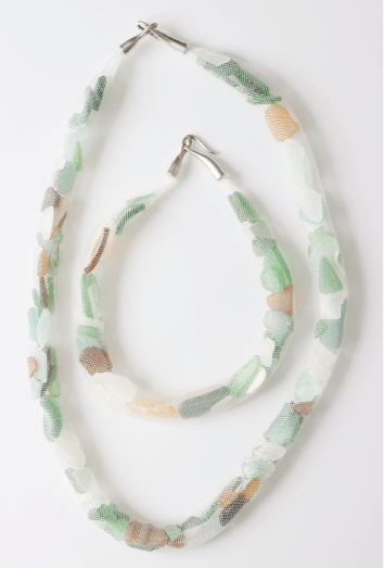 Let’s take another example: a necklace called Mediterranean Gifts. Designed by Anna Barbara, it’s made of washed-up bits of glass that Anna collected on the beach near her family’s home in Calabria. (She is actually based in Milan.) The fragments, whose edges have been softened by the tides, are encased in a very basic mesh tube. They appear to float within the tube, jostling each other when moved. The sense of floating is compounded by the lightness with which the curve of the mesh rests on the skin. The stones and the mesh sit in tension, wavering between two states: the necklace as an object and a collection of objects. What we see is a gathering together of elements that allows something else to be present, namely a surplus of ‘meaning.’ And those elements are more various than just the materials: There’s also the intentionality of the designer; the friendship I have with the designer; the long history of Calabria as a point of entry for refugees, who in Anna’s experience, are the true gifts of the Mediterranean.