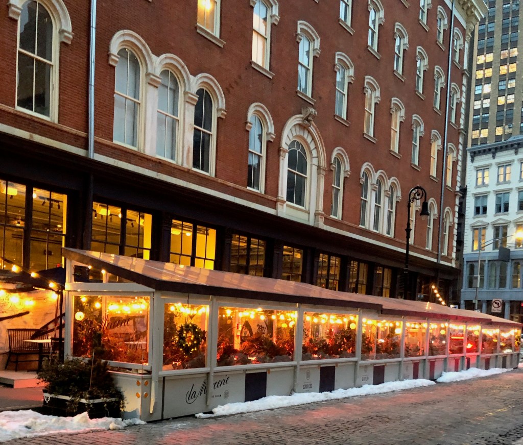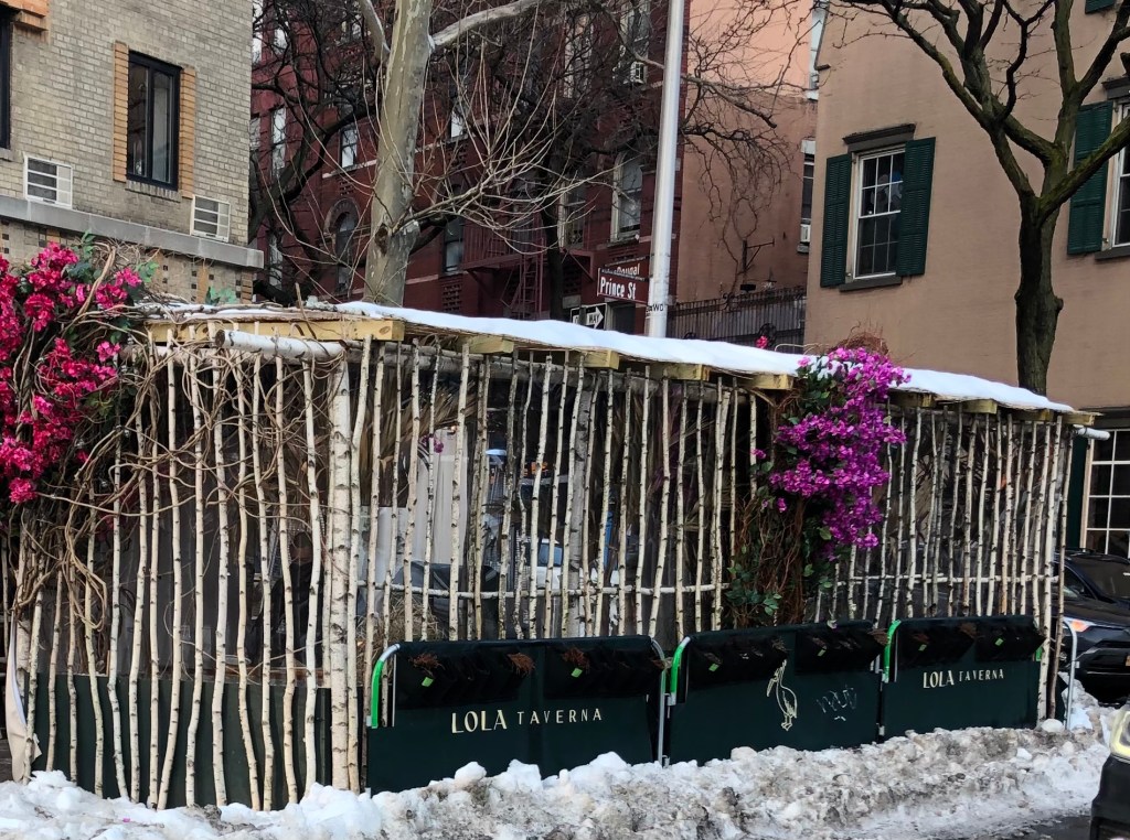 It didn’t take long for these sheds to be ornamented inside as well as out. It’s now common to find them kitted out with stylish lighting fixtures, drapes, plants, flower boxes, and blankets for diners braving freezing weather this past winter. Festooned with strings of lights, these cheerful manifestations of tactical urbanism give the city a feeling of carnival. Acting-out has become eating-out. There’s a bravado built into these carnival tents of plastic and wood that reminds New Yorkers that it’s still possible to ‘make it here.’3
