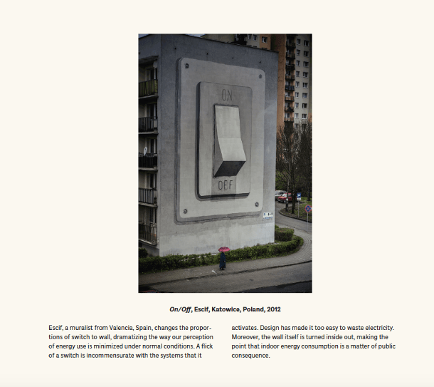 To wit, my book reflects the reciprocities between works of literature and works of contemporary design across time. This graphic by Escif in Katowice corresponds to a passage from Dante that reminds us when we seek the good (like providing electricity) with less concern than we ought to have, we will surely be punished (as with global warming.)