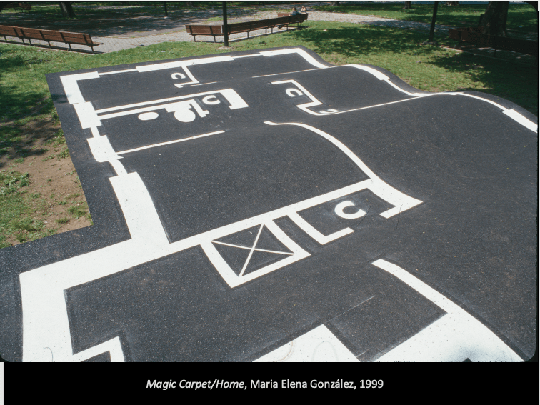 Transpose the story to Brooklyn and you have what you see in this outdoor installation. Here, Maria ElenaGonzálezreplicates the floor plan of a unit in public housing in Brooklyn that is meant to accommodate a family. (It’s not as tiny as Sutulin’s but it’s still quite small for a family of four.) The outlines of a kitchen, bath, bedrooms, and closets have been gently warped totransform the apartment into a flying carpet and a fantasy of larger living quarters. You could say it is a work of desire. The fable of Krzhizhanovsky’s “Quadraturin” plays out here, in the context of American public housing by an artist, who, incidentally, grew up in communist Cuba.