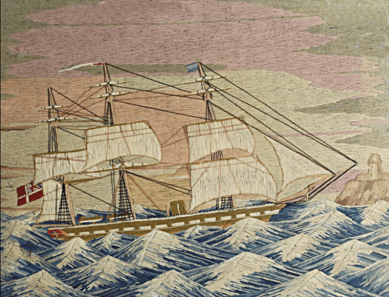 However, my interest in ‘woolies’ (a.k.a., ship portraits) has little to do with maritime labor or leisure. It has more to do with their material nature. (That and my love of the Atlantic, whose waves were the high points of summer beach trips.) Admittedly, the ships’ embroidered sails are impressive, and undoubtedly, the vessels themselves were the true subjects of these portraits. Nonetheless, it’s their oceans, like all oceans, that mesmerize.