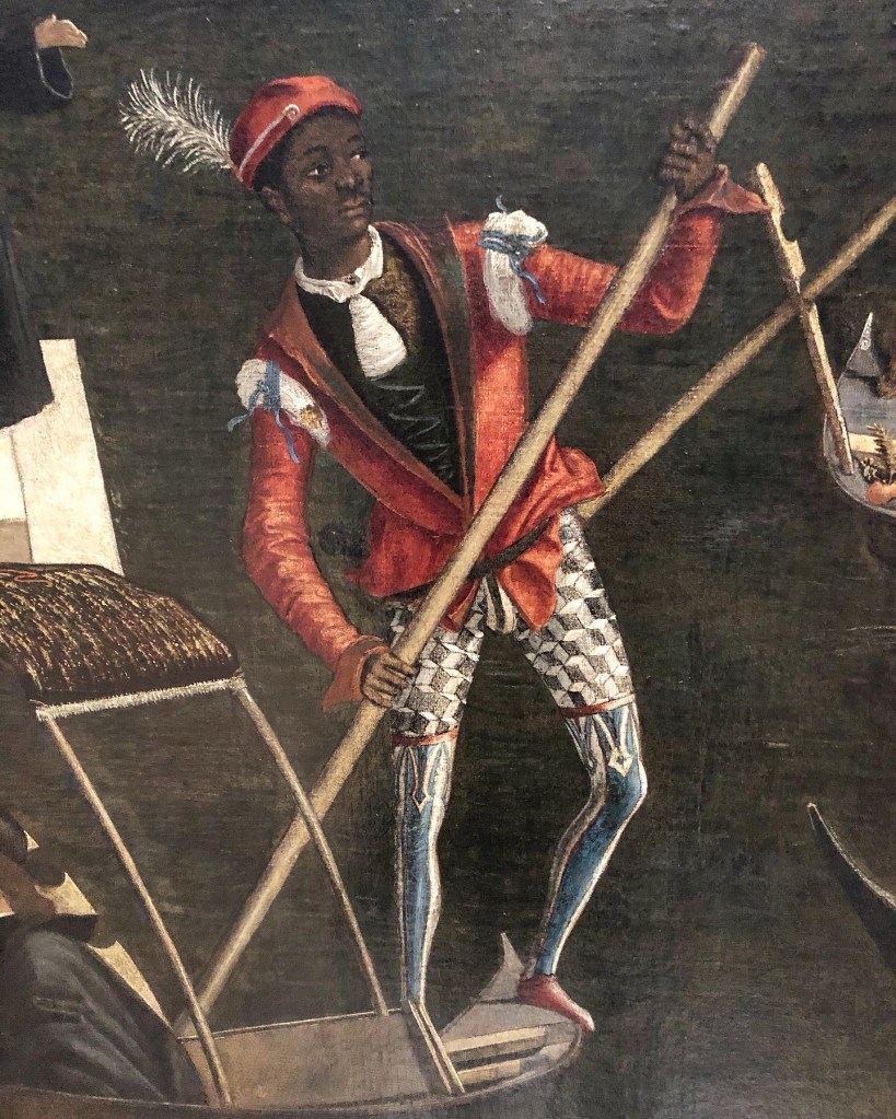 Still, it is impossible to say whether the gondolier in Carpaccio’s painting was a free man or not. As Lowe points out, “unless they are portrayed in chains, the legal status of black Africans … is always unclear: slaves cannot be distinguished from servants by their appearance or clothing.” She speculates that the clothing worn by the black gondolier portrayed by Carpaccio (which some have construed as household livery) is equally likely to have been the festival dress of the sestieri or districts of Venice. In and of itself, this tells us little; more revealing is the relative youth of Carpaccio’s gondolier. It leaves Lowe to conclude he was likely still a slave; and it leaves me to conclude that I am guilty of simultaneoulsy exoticizing the gondolier and Italian festive iconography.